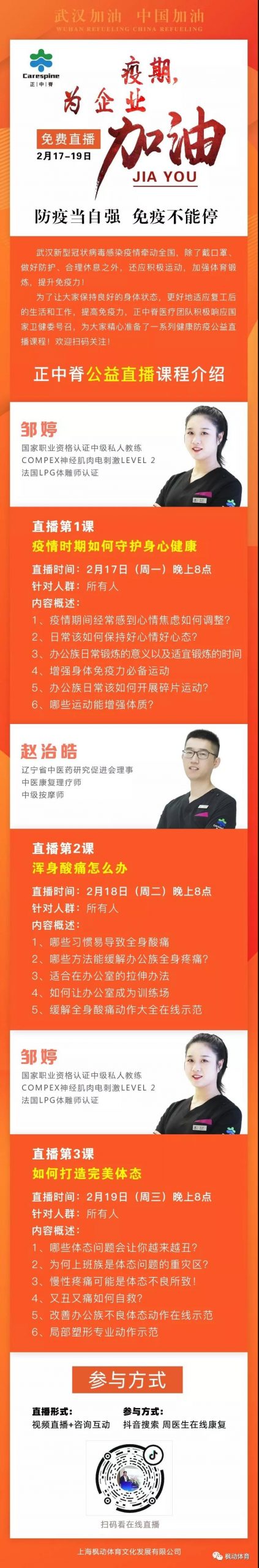为了让大家保持良好的身体状态,更好地适应复工后的工作和生活,提高免疫力,增强防疫能力。由上海枫动体育文化发展有限公司、上海正中脊医疗联合推出的“健康运动公益直播大课堂”项目正式上线,致力于为企业职工健康运动提供教学服务。