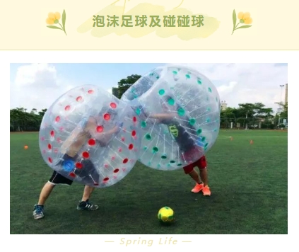 泡沫足球——每位参与者都穿上泡泡球,中间是上下通的,人钻到里面背起泡泡踢球和互相撞。每场比赛时间是5-10分钟,可以男女混搭踢球;每个队由4-6个人组成,看规定时间里哪队进球最多者为胜。