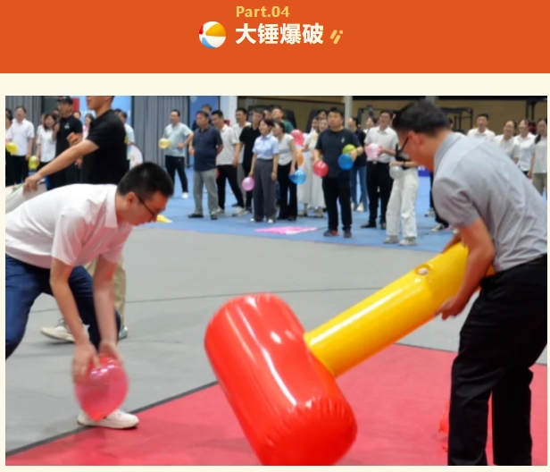 队员们两两一组或者四人一组,一人放气球,一人用手中的锤子把气球打破,用时最短者获胜!