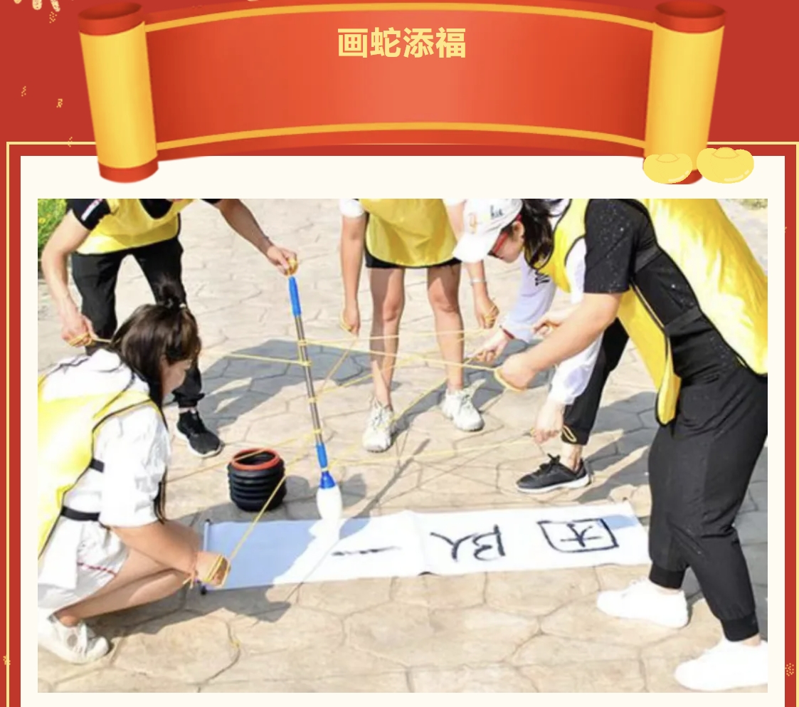 活动规则:所有队员拉绳子的末端,不得触碰毛笔,按照教练的要求写出不同书法的“福” 字,最快完成的获胜,教练也可以根据字的美观度打分。