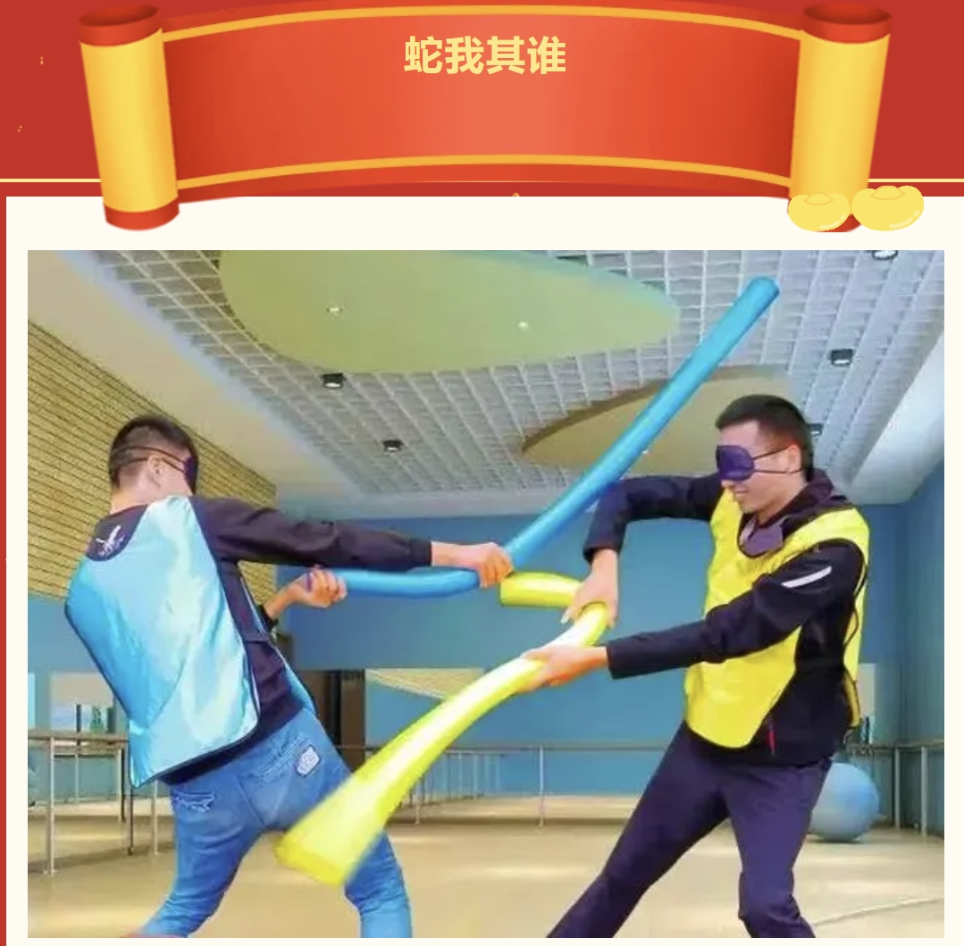 活动规则:华山论剑,蛇我其谁。参赛队员戴上眼罩,使用泡沫剑淘汰场上对手,被击中的则下场换人,最终留在场上的成员小组获胜。