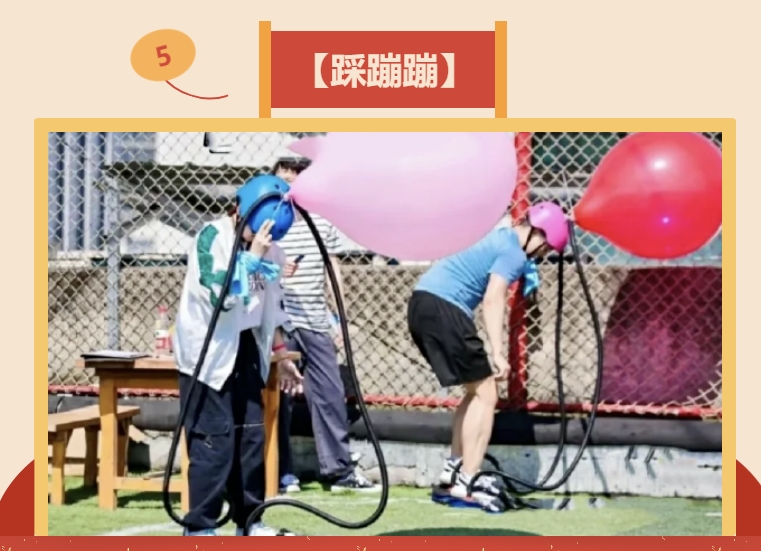 参考规则:一个人负责打气,一个人辅助捏紧气球防止漏气,最先将气球打爆的队伍获胜!速度与胆量的考验!