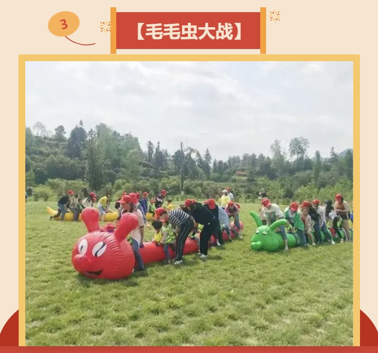 参考规则:每4名队员,通过团队协作用一个充气柱子将球推动向前,抵达 终点然后换下一个接力小分队接力,用时最短的小组名次前列。