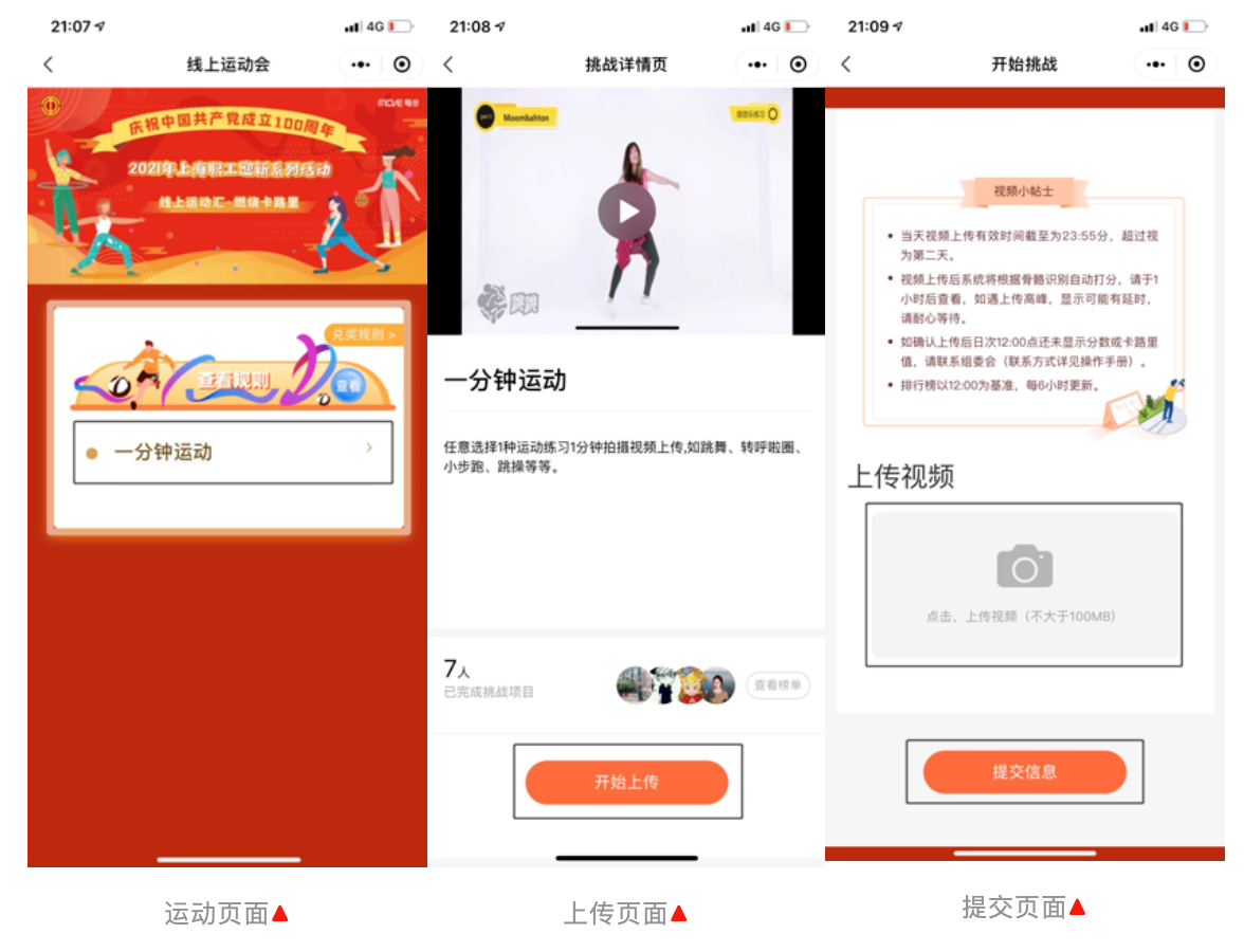 第二步:依次点击“一分钟运动”、“开始上传”、“提交信息”即可参赛(如下图所示)