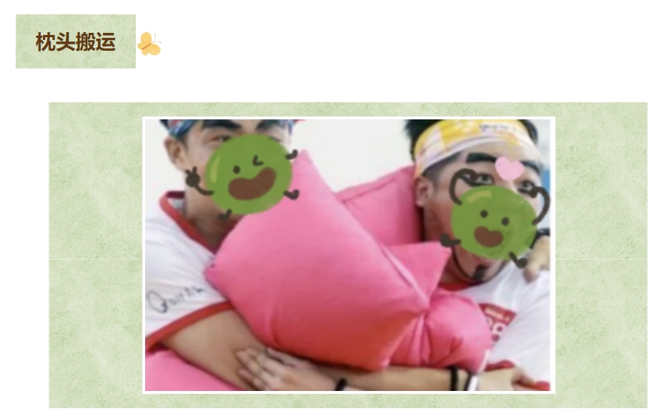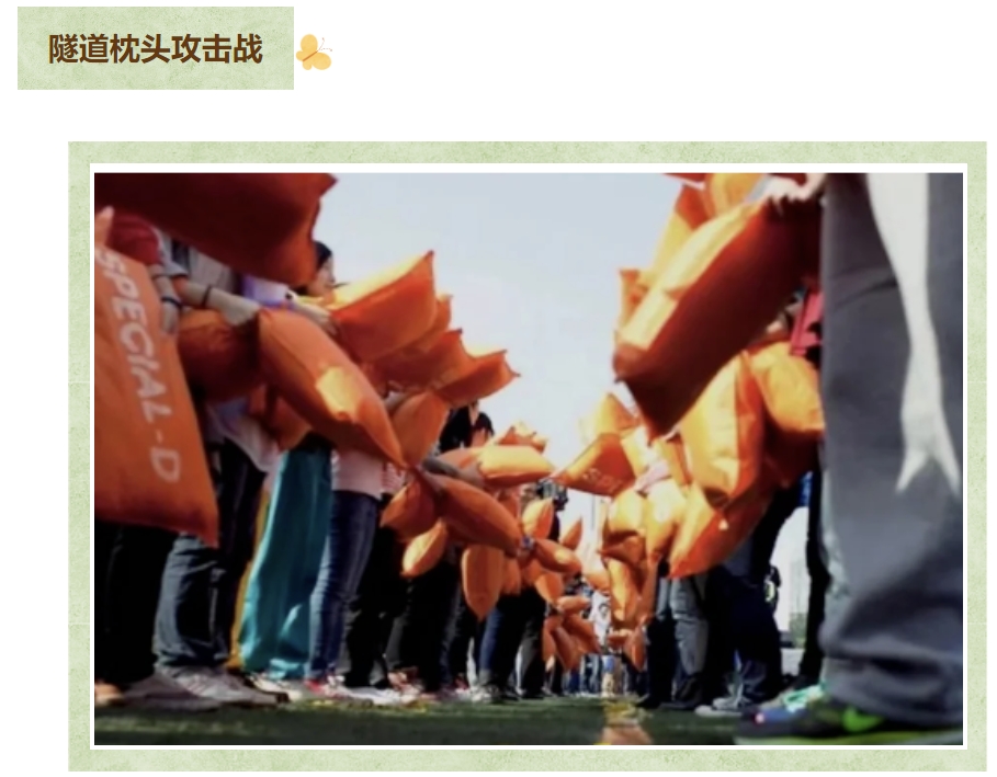 玩法:具有惩罚性质(捂嘴笑)。获胜两个小组每人手拿一个枕头面对面战成两列,形成一个“隧道”。失败两个小组排成一列依次穿过“隧道”,穿行过程中获胜两个小组成员可以用枕头拍打攻击。