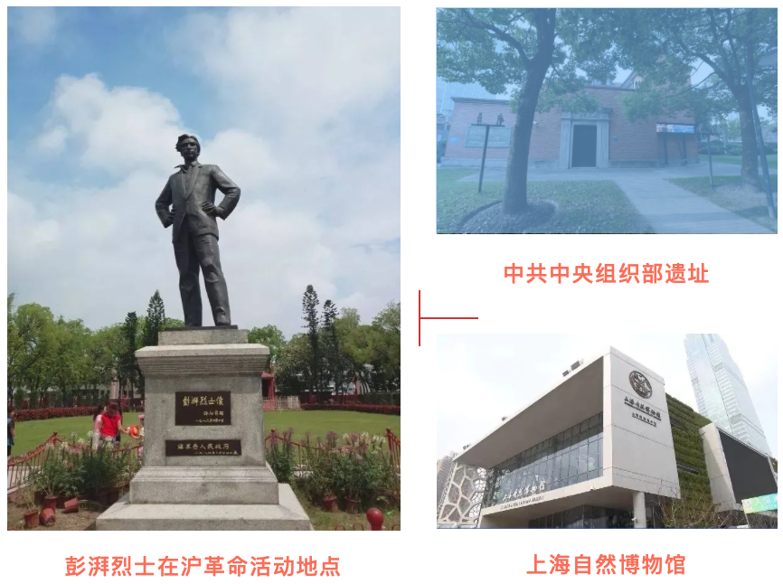 线路二:中共中央组织部遗址(纪念标志)——中共淞浦特委机关旧址陈列馆(中共淞浦特委办公地点旧址)——上海自然博物馆——彭湃烈士在沪革命活动地点——中国劳动组合书记部旧址陈列馆(中国劳动组合书记部旧址)