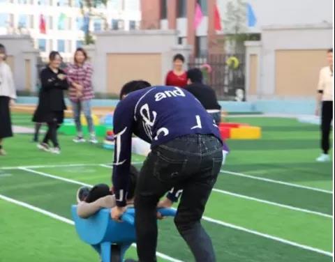 游戏规则:幼儿坐在推车里,家长需要手推小车折返前行,中途如果幼儿从小车里倒下,则从起点重新开始,用时最短获胜。