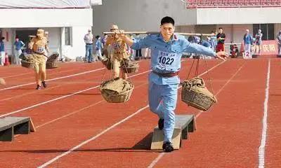 裁判发令后,第一棒的两名运动员手拿一只箩筐将途中的粮食捡起,运动员需将自己跑道上所有粮食全部捡起(如有遗漏的则需将遗漏的粮食捡至筐内方能传递至下一名队员)。第二棒运动员将两个箩筐用扁担挑起将粮食送至下一棒运动员,第三棒运动员将两筐粮食用独轮车运输至前线,若途中粮食掉落需捡起后继续前行,中途时间计算在总时间内。项目全程计时,依据各队用时排列名次,用时少者列前。