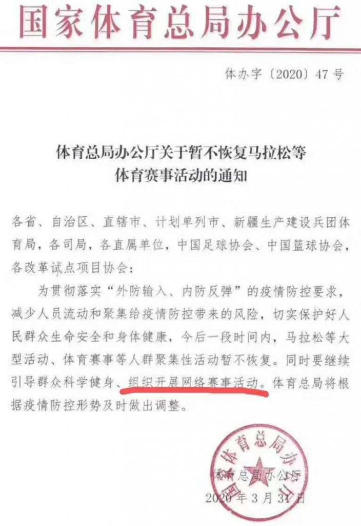 中国国家体育总局办公厅31日晚发布通知称,为贯彻落实“外防输入、内防反弹”的疫情防控要求,减少人员流动和聚集给疫情防控带来的风险,切实保护好人民群众生命安全和身体健康,同时要继续引导群众组织开展网络赛事活动。