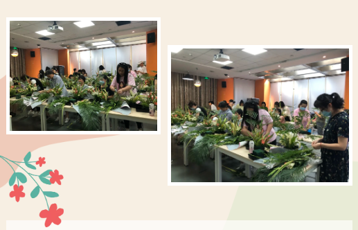一束束普通的鲜花,在经过大家的巧手设计和精工裁剪中,变成了一件件独具匠心又饱含深情的艺术作品。每个人欣赏着自己的作品,充满了成就感和喜悦感,大家在学习插花技艺的同时,感受到了鲜花带来的愉悦心情。