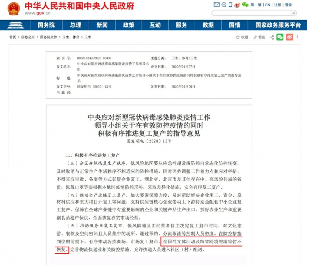 近日,国务院联防联控机制印发通知,强调结合当前疫情防控形势,落实分区分级防控要求,推进生产生活秩序逐步恢复。明确指出:全国性文化体活动及跨省跨境旅游等暂不恢复。