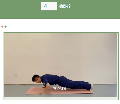 在运动过程中,每完成1个规定动作,需同时依次报数。视频总长度为1分钟左右,完成俯卧撑动作不低于20个。