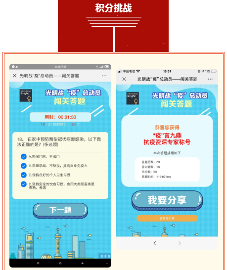 通过知识问答挑战可以让参赛队员学习更多的相关知识,系统根据参赛员工答题的正确率实时生成排行榜。可采取微信答题模式,每人每天限一次答题机会,通过分享朋友圈增加一次答题机会。