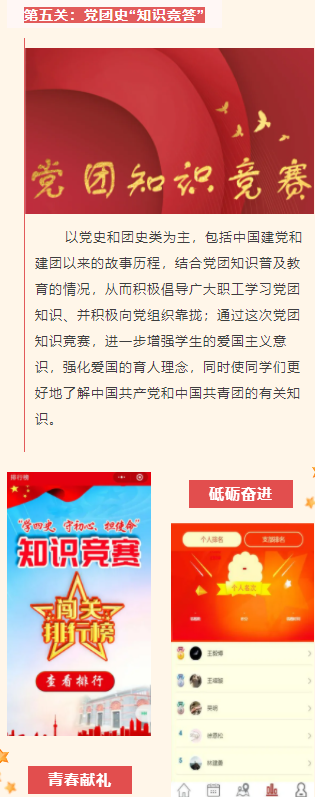 以党史和团史类为主,包括中国建党和建团以来的故事历程,结合党团知识普及教育的情况,从而积极倡导广大职工学习党团知识、并积极向党组织靠拢;通过这次党团知识竞赛,进一步增强学生的爱国主义意识,强化爱国的育人理念,同时使同学们更好地了解中国共产党和中国共青团的有关知识。